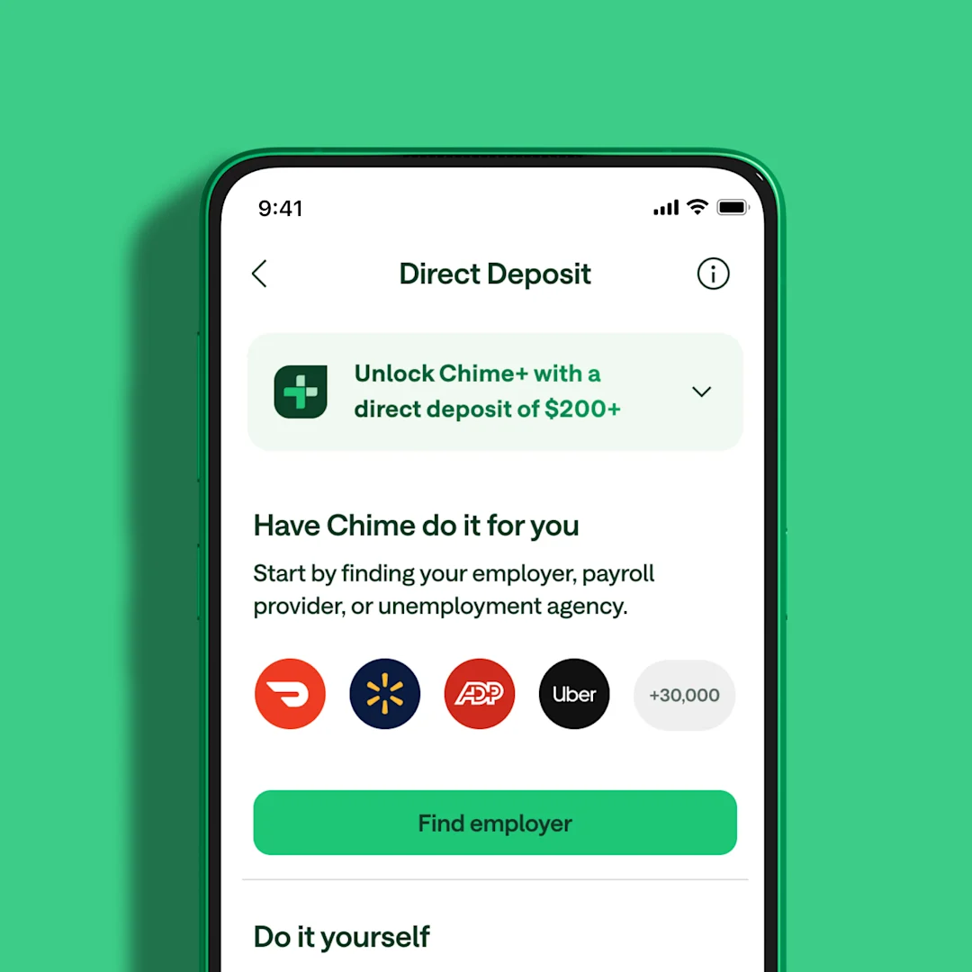 Receive a qualifying direct deposit of $200+ into the Chime Checking Account within 45 days of signing up.
